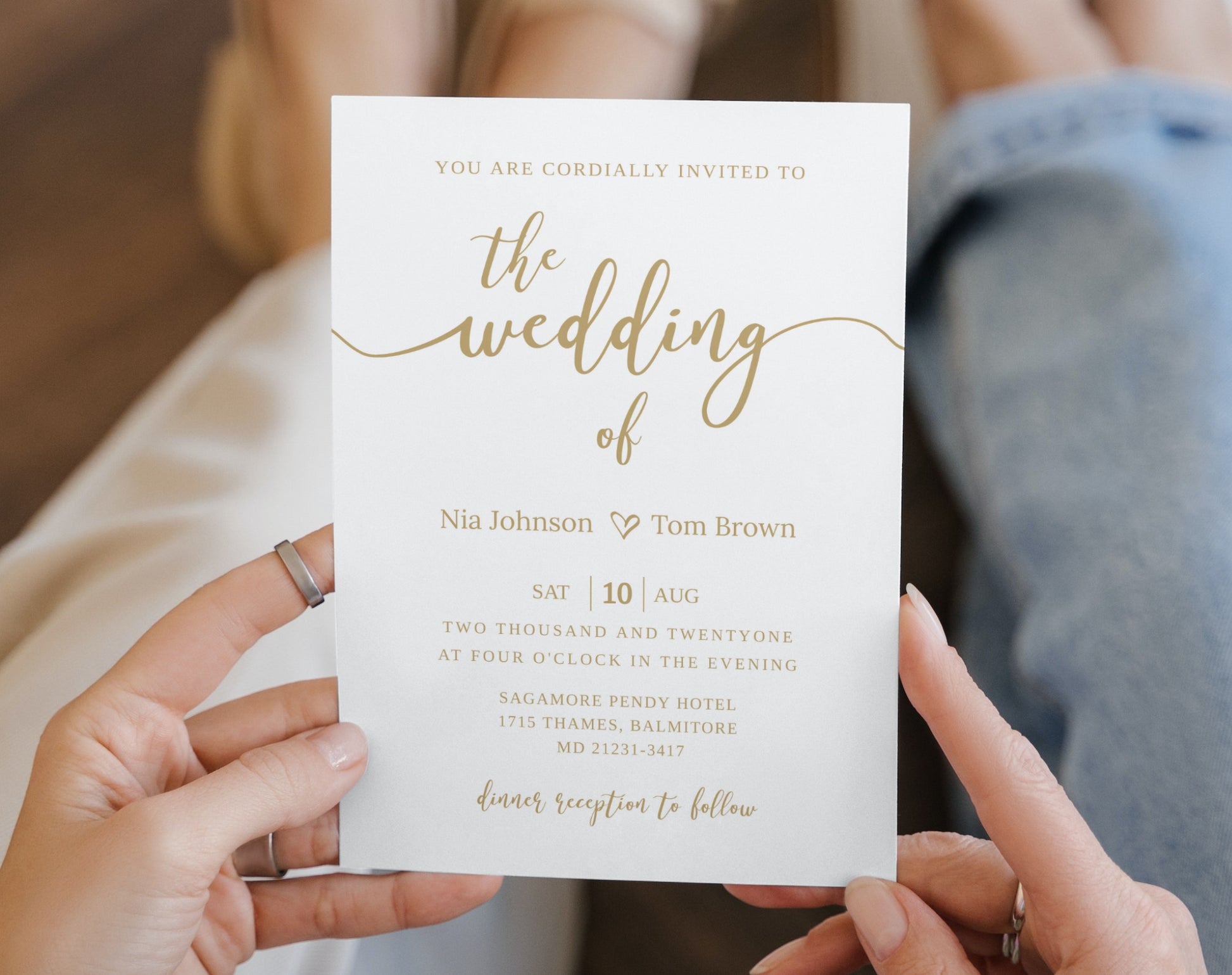 This GOLD WEDDING INVITATION TEMPLATE features beautiful calligraphy design. All text is 100% fully editable. You can change the font color, style, size or reposition all text. There is also an option to add a photo or a backside if you wish.